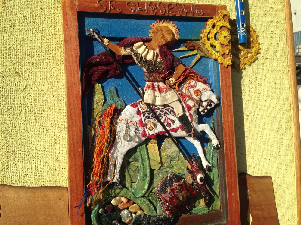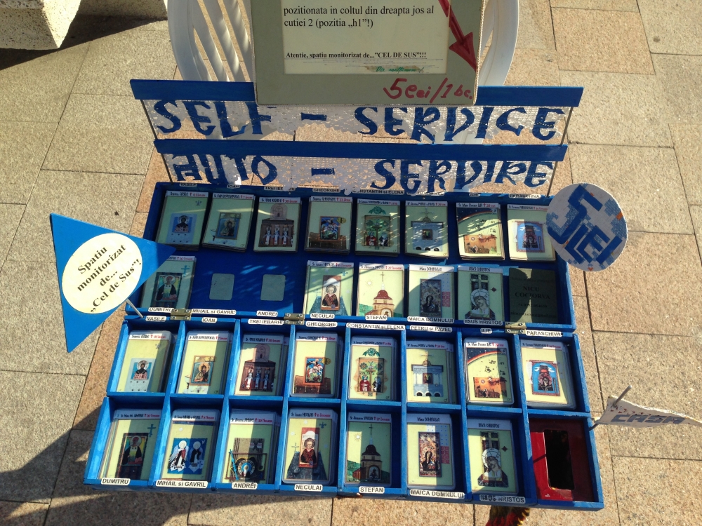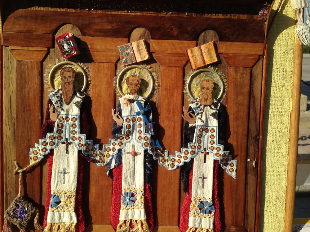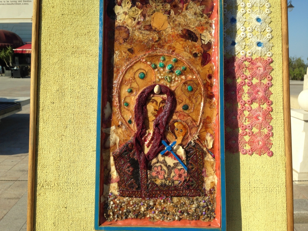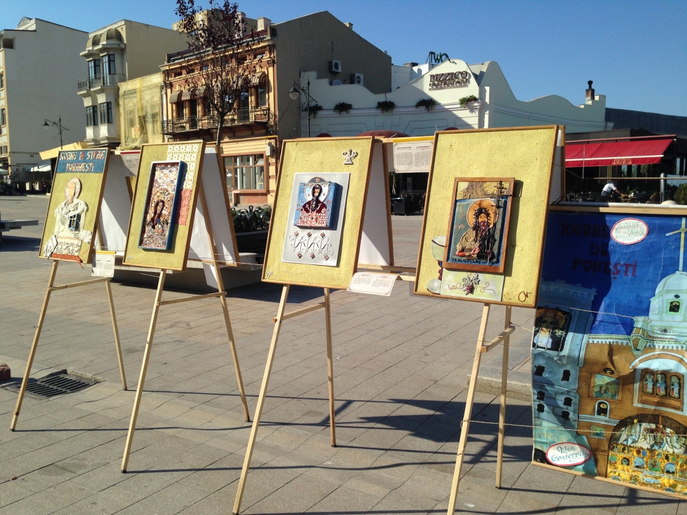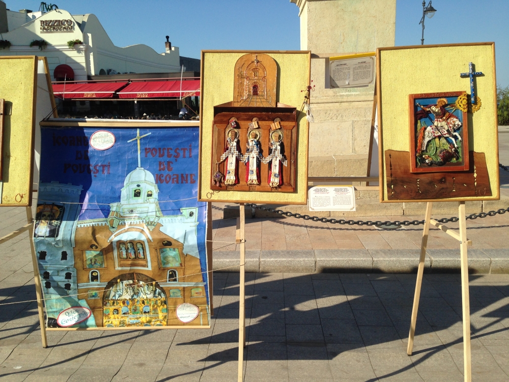 „Icoane în straine românești” și în... fagure Mirela Dogaru, organizatoare de târguri și expoziții la Mangalia și Constanța, ne-a mai spus că sunt în total 20 de expozanți. În mod deosebit, aceasta și-a exprimat încântarea pentru un artist popular participant la târg, care doar expune, nu vinde, „Icoane în straine românești”, cum se numește și expoziția sa. Lucrările sale sunt cu totul inedite, fiind icoane realizate din diferite materiale, precum bucăți de maramă, cămăși și chiar... fagure. „E un artist popular băcăuan Nicolae Cociorva, l-am cunoscut la Bistrița întâmplător și mi-au plăcut tare mult lucrările lui și am insistat să vină. I-am înlesnit și sponsorizat cazarea, drumul, fiindcă am ținut neapărat să vină. Pare... căzut din cer, fiindcă el nu vinde, ci creează niște lucruri minunate, icoane în straie românești. Materialele folosite sunt simple, din bucăți de straie românești vechi, catrințe, cămăși”, a mai precizat Mirela Dogaru.