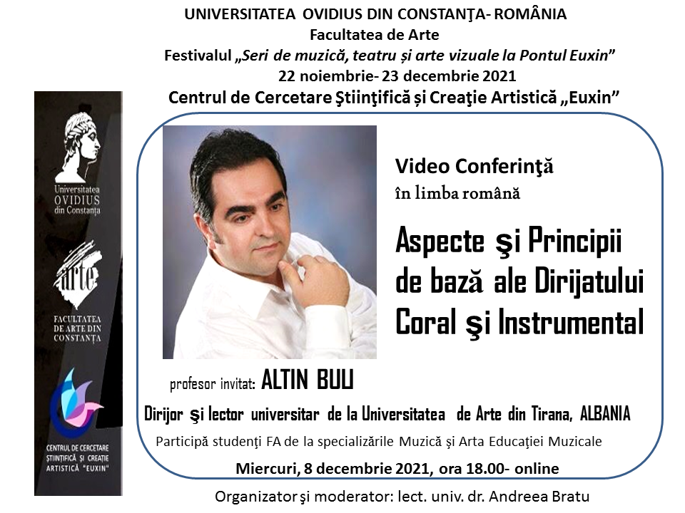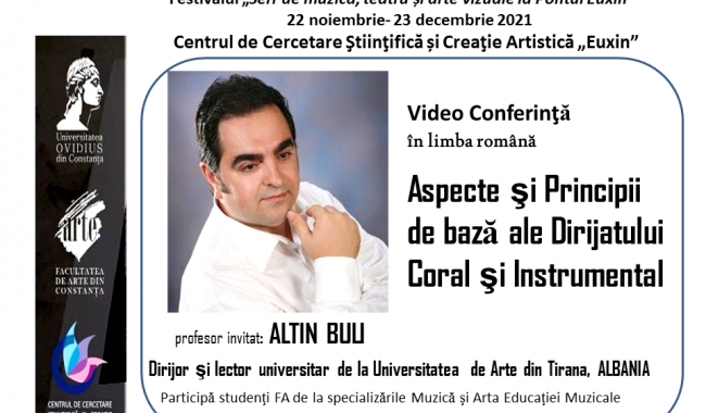 Cadre didactice ale Facultății de Arte a Universității “Ovidius” Constanța (UOC) și studenți de la Specializările Muzică și Arta Educației Muzicale participă miercuri, 8 decembrie 2021, în intervalul orar 18.00 - 20.00, la un eveniment online de anvergură, al cărui invitat este o personalitate de referință a vieții cultural-academice din Albania. Este vorba despre apreciatul dirijor și lector universitar dr. Altin Buli, de la Universitatea de Arte din Tirana, Albania, profesor invitat la video-conferința în limba română cu titlul “Aspecte şi  Principii de bază ale Dirijatului Coral şi Instrumental’’, care se va desfășura pe zoom.